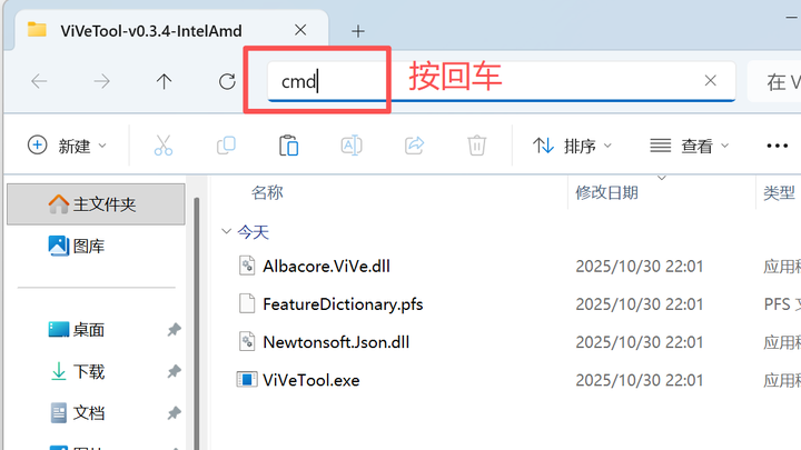 首先下载 ViveTool 工具,下载完成后将其解压到电脑任意指定位置。接下来找到 ViveTool 的解压文件夹并进入,在文件路红上面直接输入cmd按回车。