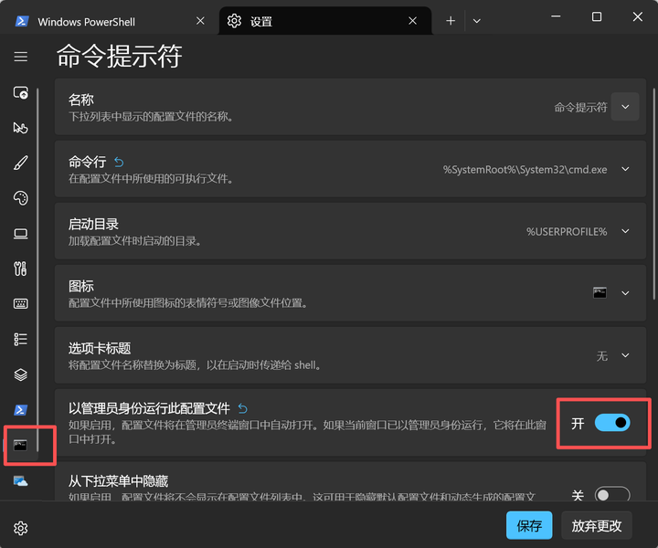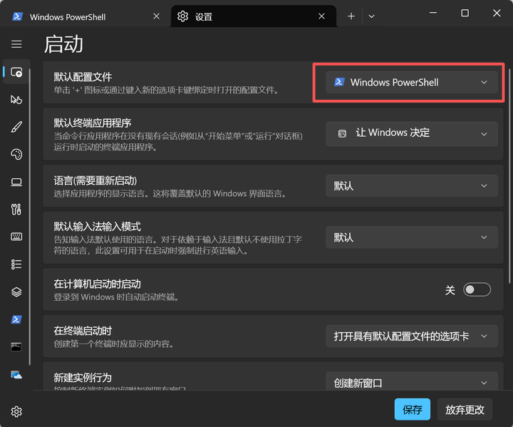 然后在终端设置里带点击左侧导航栏的启动,在最上面将默认配置文件修改为命令提示符,完成后再点击底部保存按钮。如果是PowerShell也可以。