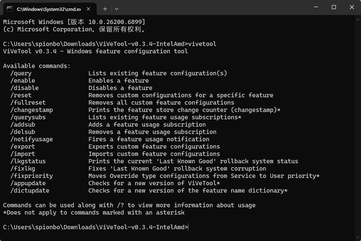 然后在终端里敲入 “vivetool”,按回车看看会不会报错。如果能正常弹出一堆参数说明,就说明之前的步骤都没问题;如果是弹出红色错误或者提示找不到命令,那可能是文件夹没找对,继续重新来一遍。