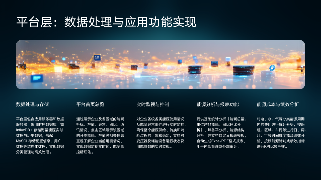 平台层作为核心应用中枢,包含应用服务器和数据服务器,可在PC端或移动端实现应用。它提供了数据监视实时化、能源管控精细化等多种功能,是系统的核心处理和展示层。在这里,能源数据得到深度处理和分析,为企业的能源管理决策提供有力支持。