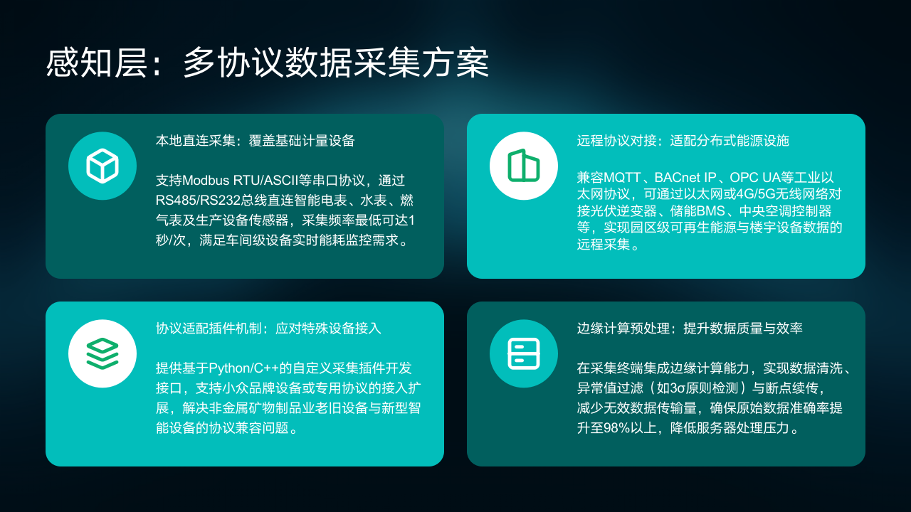 其价值主张之一是打破数据孤岛,实现能源透明化管理。通过统一的数据采集平台,它能够整合电、水、气、热等全品类能源数据,支持20多种工业协议,对接多种智能设备,有效解决了传统管理中数据分散、滞后的问题,让企业对能耗数据一目了然且能精确核算。