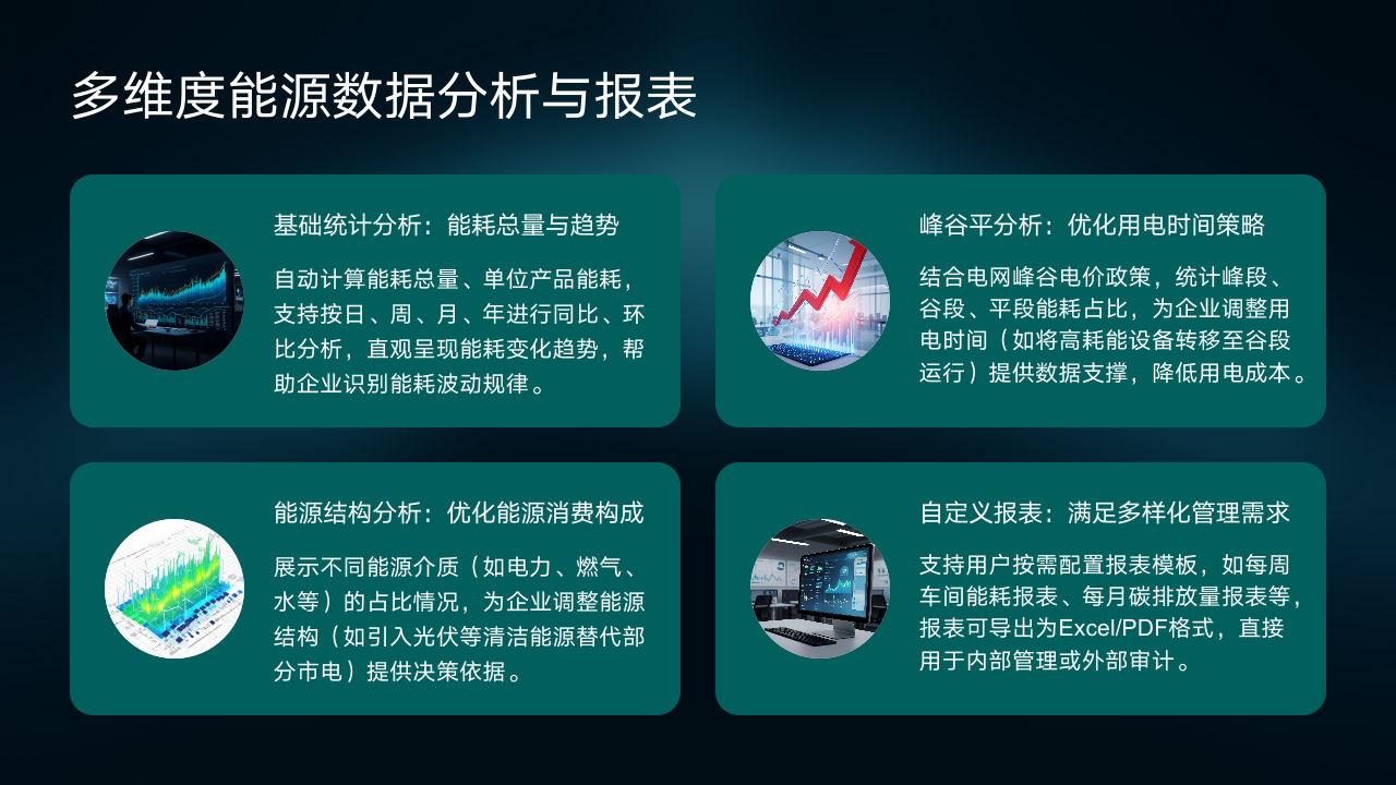 能源分析与报表功能提供基础统计分析、峰谷平分析、能源结构分析,支持自定义报表模板并自动生成Excel/PDF格式报表,满足内部管理与外部审计需求。