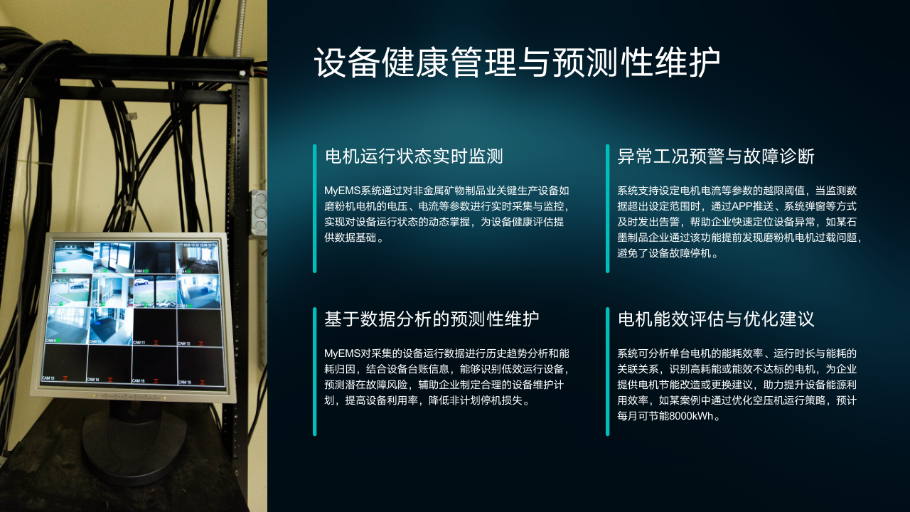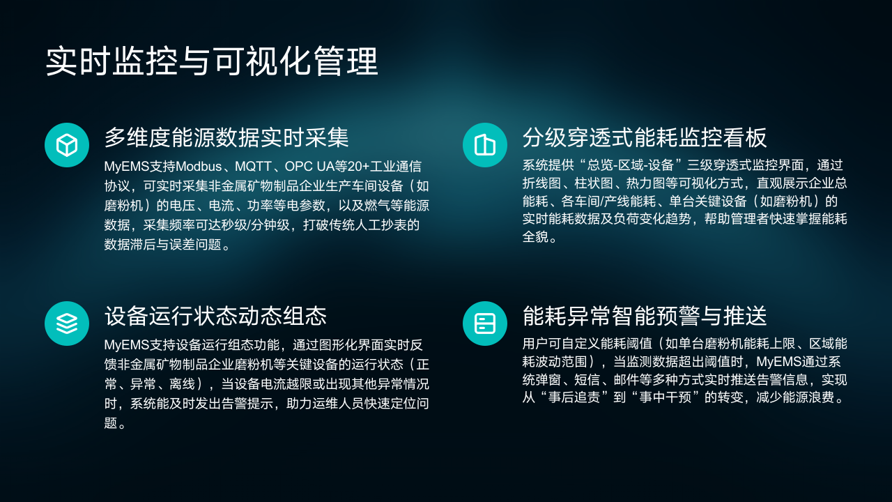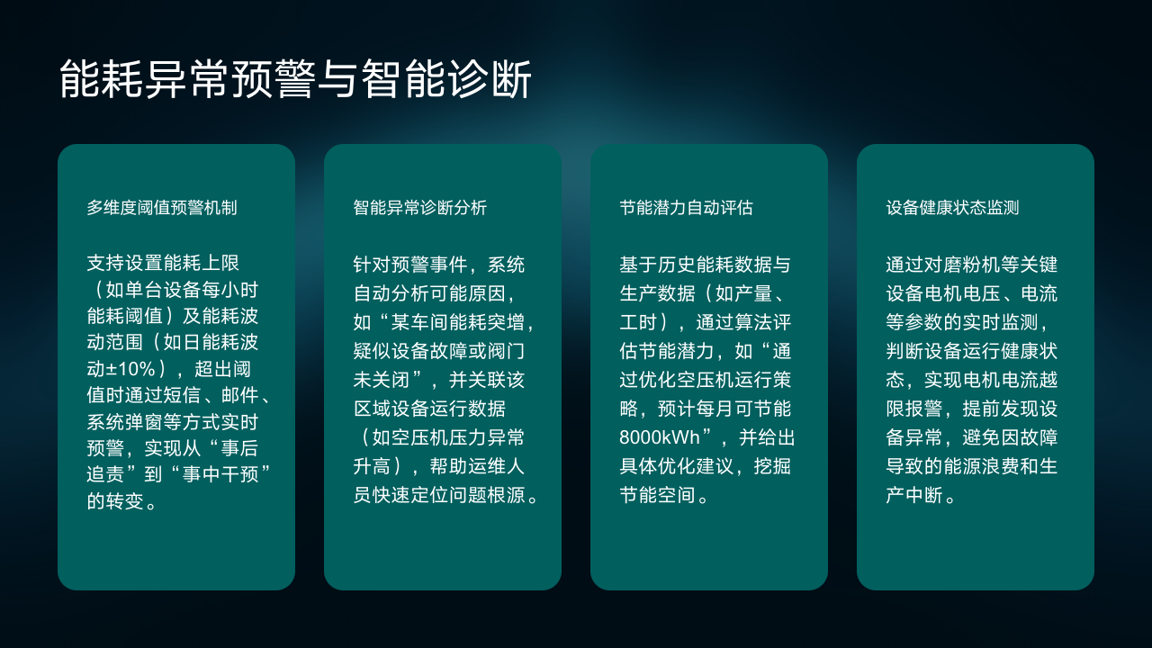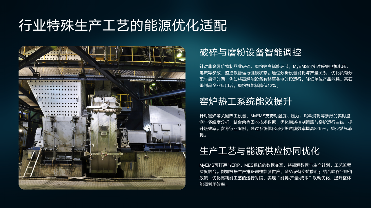前面我们了解了能源管理各方面的功能,包括监控、分析、预警等。接下来,我们将聚焦于非金属矿物制品业定制化解决方案。这是针对该行业特性打造的专属方案,能更好适配其生产流程。后续我们会看到针对磨粉机等设备及能源管理的具体定制策略。
