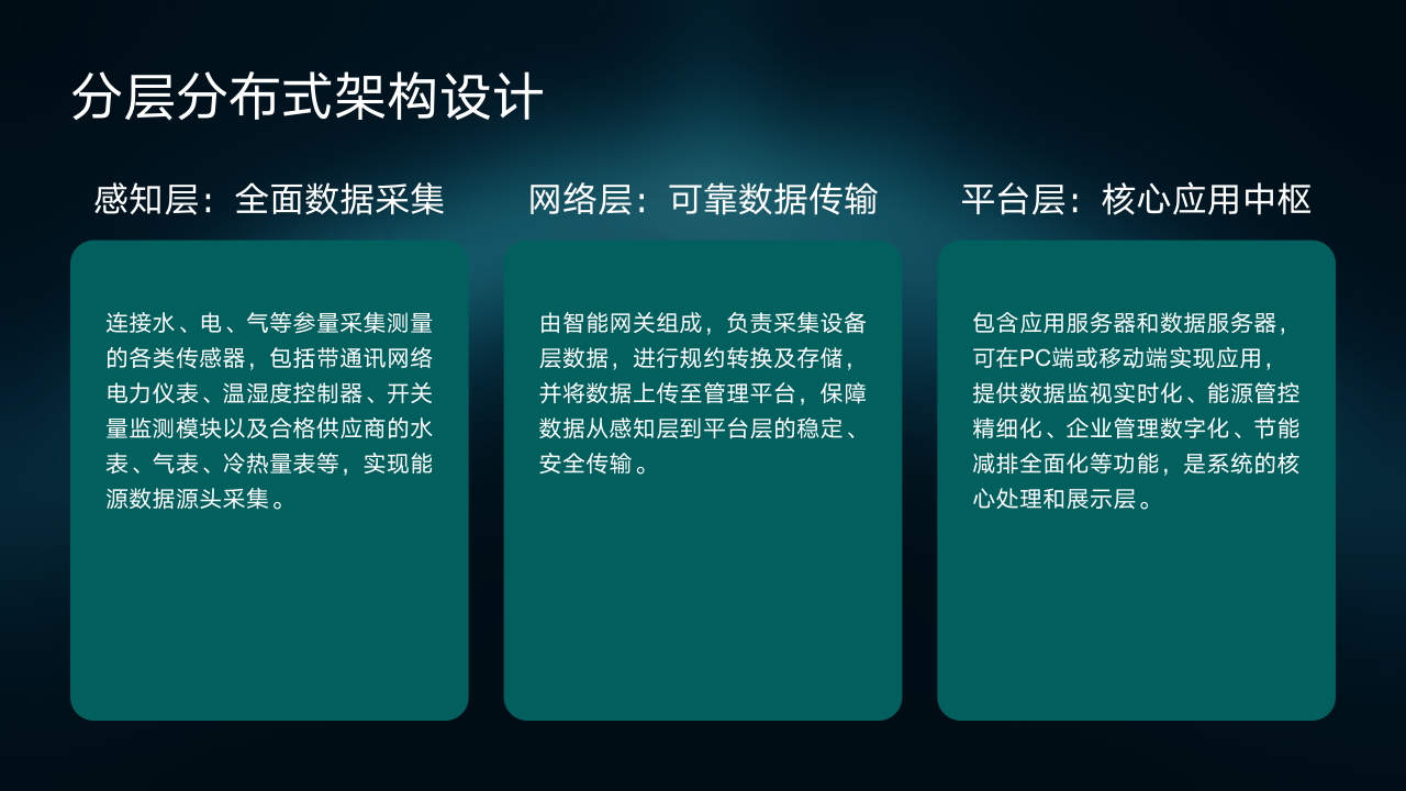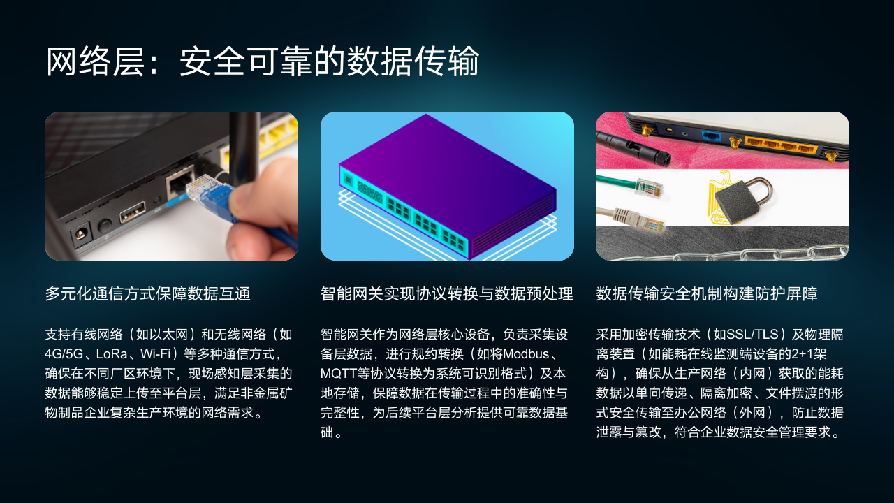 网络层负责可靠的数据传输,由智能网关组成。智能网关采集设备层的数据,进行规约转换及存储,然后将数据上传至管理平台。它保障了数据从感知层到平台层的稳定、安全传输,如同一条坚固的桥梁,确保能源数据能够准确无误地到达核心处理中枢。