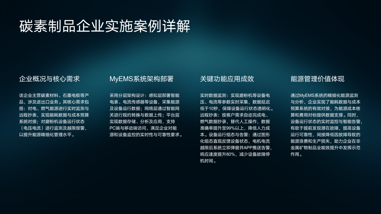 以碳素制品企业为例,该企业主营碳素材料、石墨电极等产品且涉及进出口业务,其核心需求在于提升能源精细化管理水平,包括对电、燃气能源实时监测与远程抄表、实现能耗数据与成本预算系统对接、对磨粉机设备运行状态监测及越限报警。