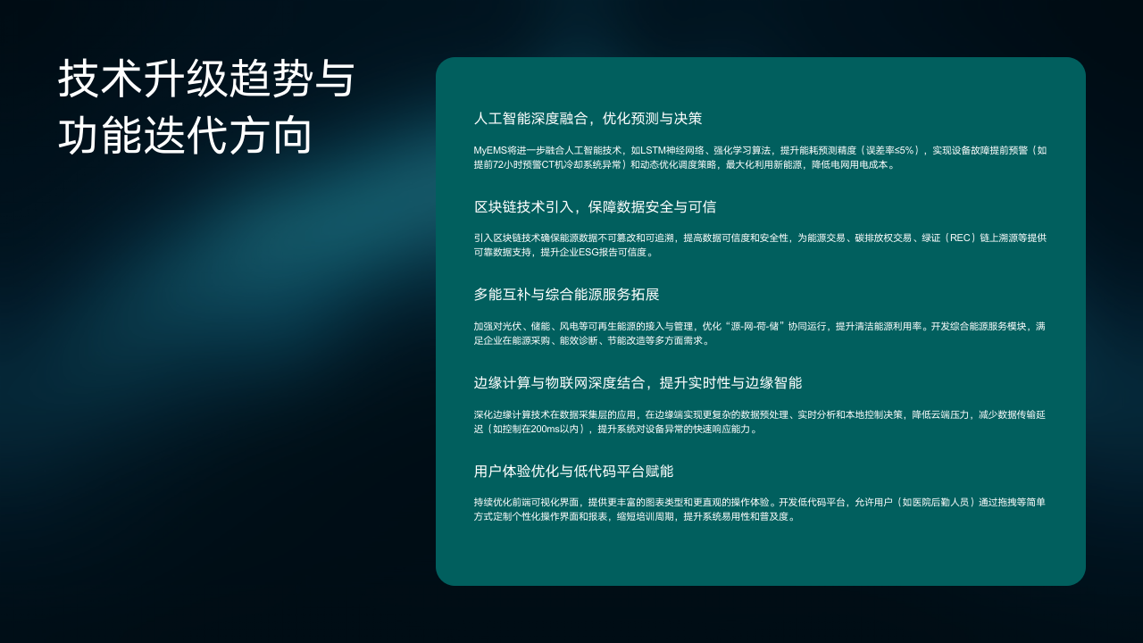 MyEMS系统具有多方面的技术升级趋势与功能迭代方向。在人工智能融合方面,将进一步结合LSTM神经网络、强化学习算法等,提升能耗预测精度,将误差率控制在5%以内,实现设备故障提前预警,如提前72小时预警CT机冷却系统异常,同时动态优化调度策略,最大化利用新能源,降低电网用电成本。
