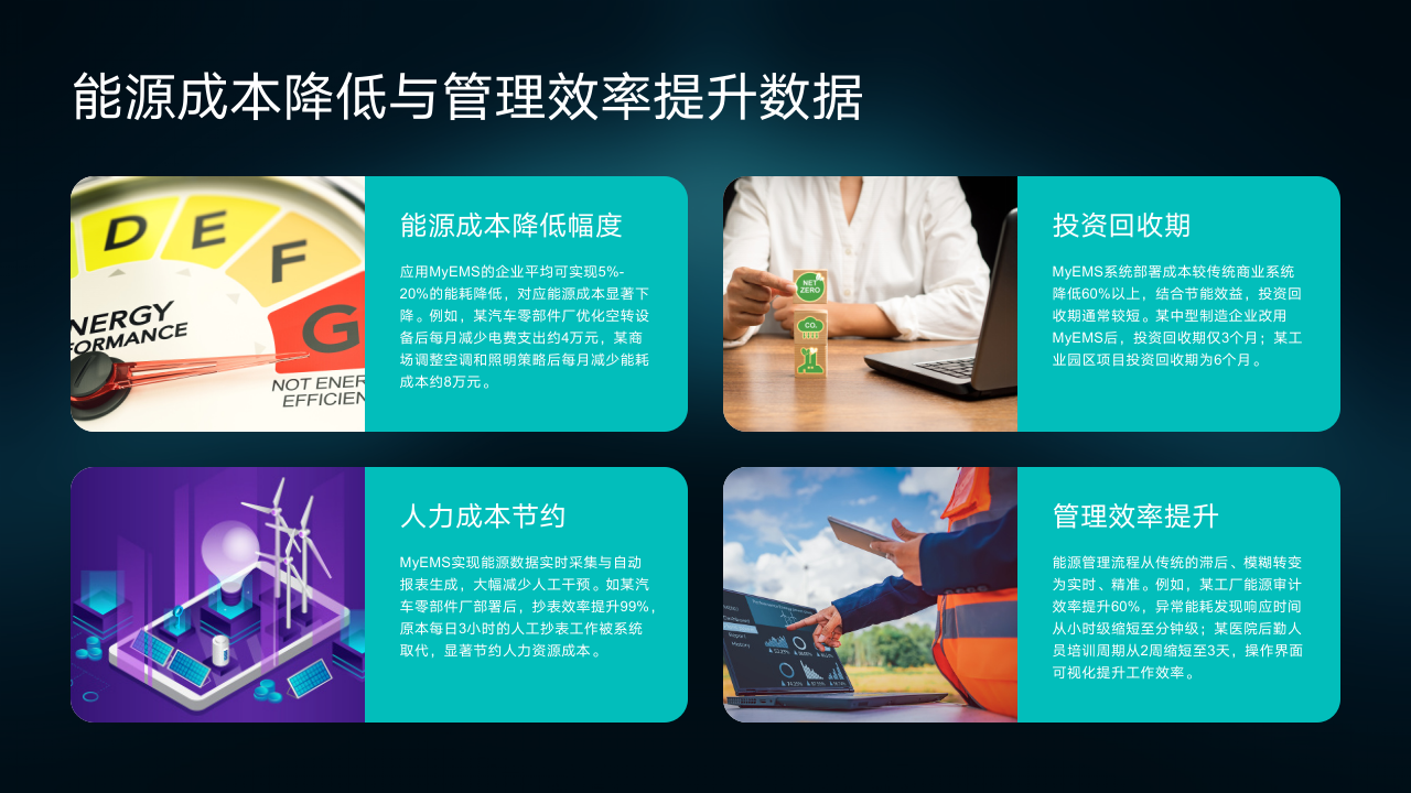 在投资回收期方面,MyEMS系统部署成本较传统商业系统降低60%以上,结合节能效益,投资回收期通常较短。如某中型制造企业改用后,投资回收期仅3个月;某工业园区项目投资回收期为6个月,这表明企业能快速收回成本并开始盈利。