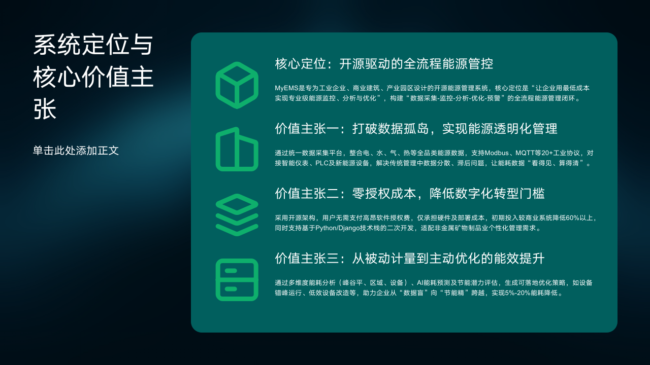 MyEMS开源能源管理系统具有明确的系统定位与核心价值主张。其核心定位为开源驱动的全流程能源管控,专为工业企业、商业建筑、产业园区而设计。该系统致力于让企业以最低成本实现专业级的能源监控、分析与优化,构建起“数据采集 - 监控 - 分析 - 优化 - 预警”的全流程能源管理闭环。