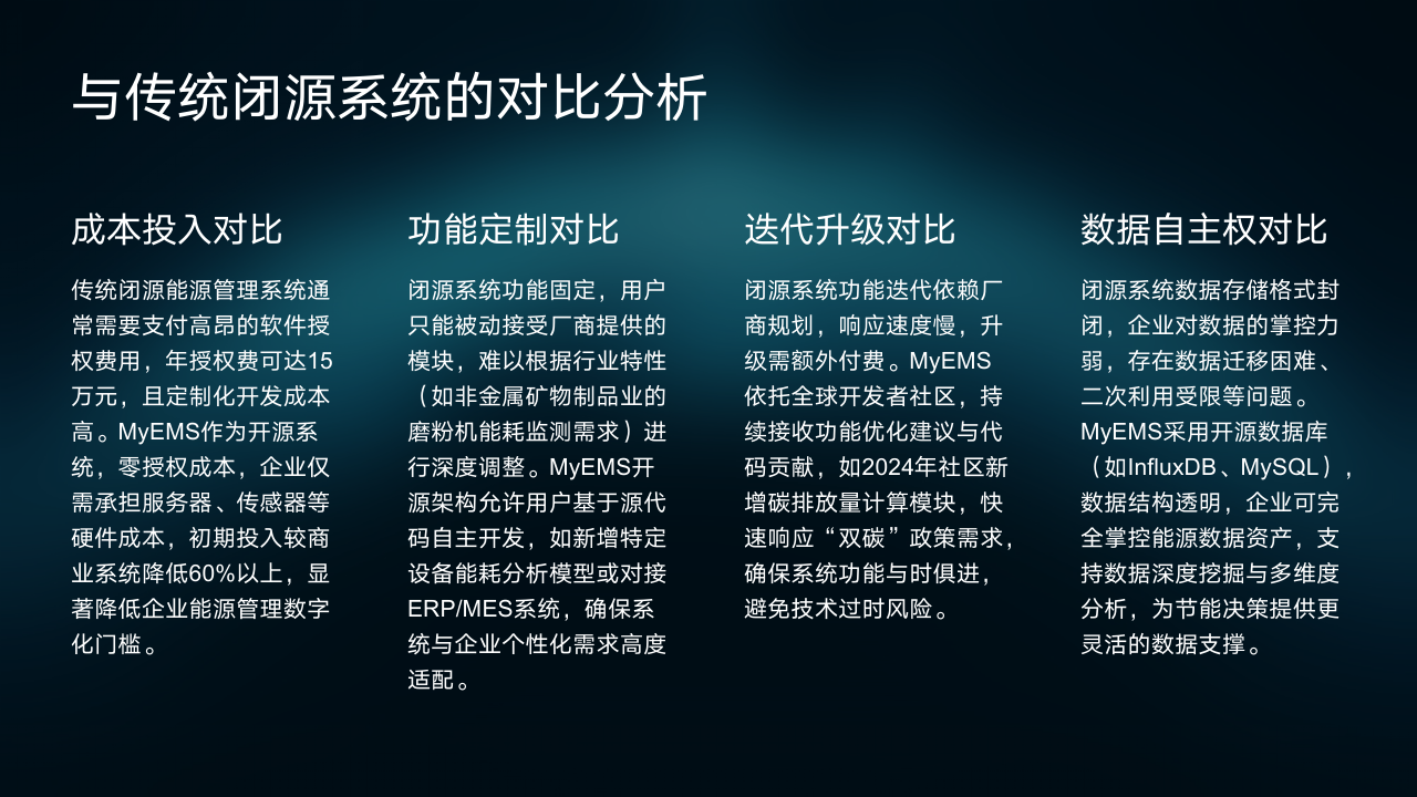 在能源管理系统的选择上,MyEMS开源能源管理系统与传统闭源系统相比,具有显著优势。从成本投入看,传统闭源系统软件授权费高昂,年授权费可达15万元,定制化开发成本也高。而MyEMS零授权成本,企业仅承担硬件成本,初期投入较商业系统降低60%以上,大幅降低企业能源管理数字化门槛。
