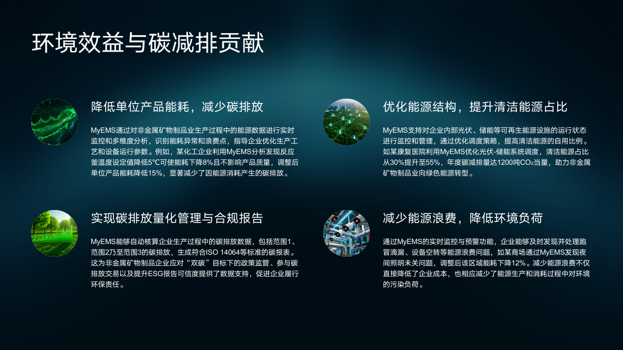 MyEMS在环境效益与碳减排方面贡献显著。一方面,通过对非金属矿物制品业生产过程能源数据实时监控与多维度分析,可识别能耗异常与浪费点,指导企业优化生产工艺和设备运行参数。如某化工企业利用其分析,降低反应釜温度设定值,使单位产品能耗降低15%,大幅减少碳排放。