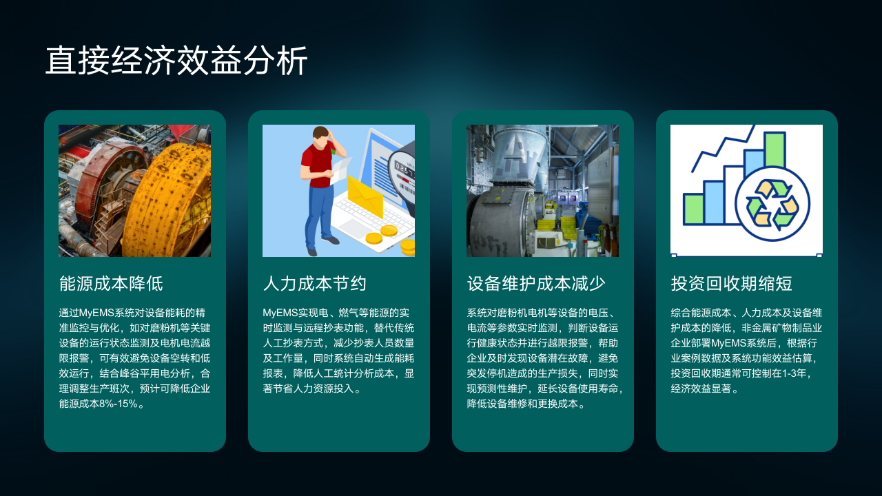综合能源、人力和设备维护成本的降低,非金属矿物制品业企业部署MyEMS系统后,根据行业案例数据及系统功能效益估算,投资回收期通常可控制在1 - 3年,经济效益十分显著。