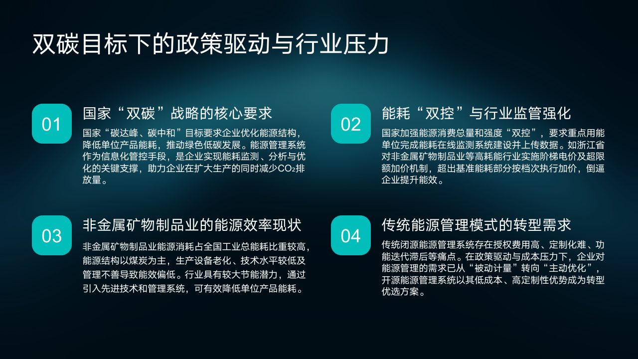 在“双碳”目标的大背景下,非金属矿物制品业面临着政策驱动与行业压力。国家“双碳”战略要求企业优化能源结构,降低单位产品能耗,实现绿色低碳发展。能源管理系统作为关键支撑,能助力企业在扩大生产的同时减少CO₂排放量,这是企业必须要遵循的核心要求。