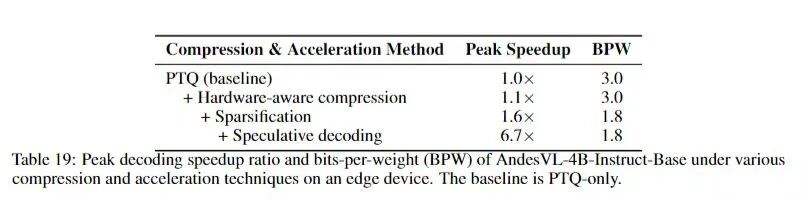 结合自研的投机解码算法、模型稀疏化及联发科天玑 9500 芯片的硬件压缩技术,在 AndesVL-4B 上,我们实现了比无压缩优化的自回归模型高达 6.7 倍的峰值解码加速比。通过极致的模型压缩,模型的 BPW 也大幅下降至 1.8。