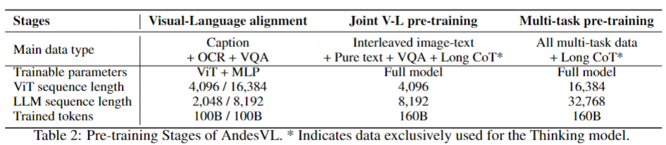 AndesVL 的预训练阶段包含三个步骤:视觉 - 语言对齐、视觉 - 语言联合预训练和多任务预训练: