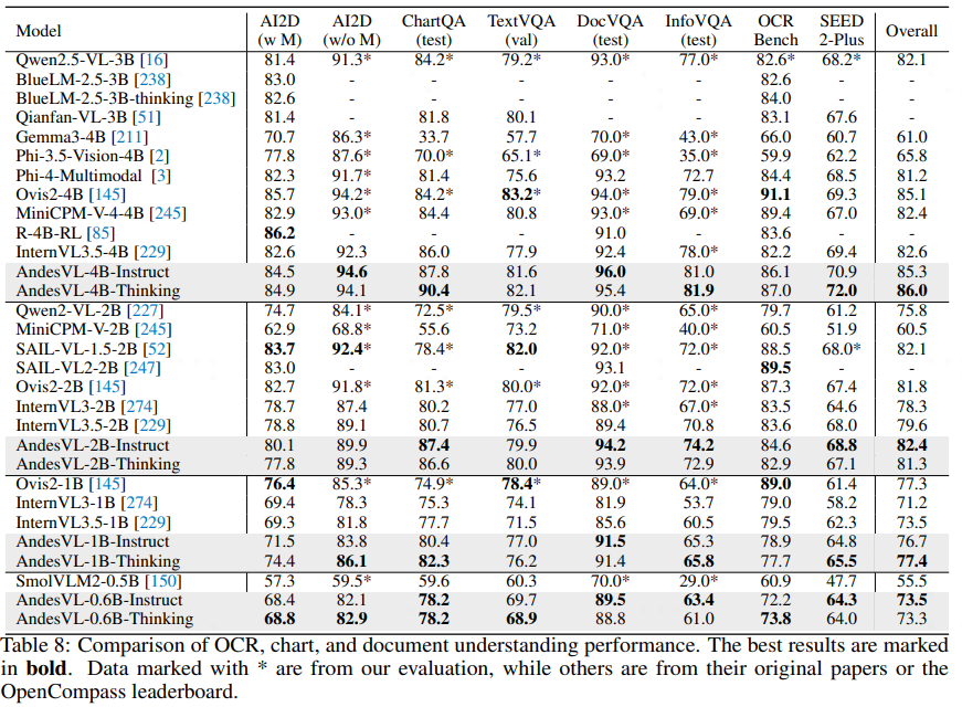 对于更小尺寸的模型,AndesVL-2B-Instruct、AndesVL-1B-Thinking 和 AndesVL-0.6B-Instruct 模型均在各自规模组别中夺得第一,展现出全系列模型的优秀视觉文本理解能力。