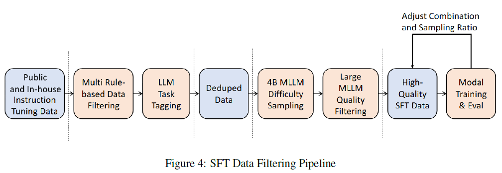 监督微调数据经过多阶段的数据过滤流程,包括单模态过滤、任务聚类及基于 LLM 的评分机制,最终构建了一个包含约 1600 万条数据的高质量微调数据集。