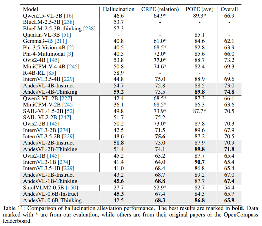 AndesVL 各尺寸模型均排名第一,4B 和 0.6B 模型分别得分 74.8 和 65.9,与其他同尺寸模型相比有显著优势,而且这种优势在更小尺寸模型上更加明显。这表明我们的架构在保持高精度的同时,还提供了优异的幻觉缓解能力,即使在最小的 0.6B 版本中也依旧如此。