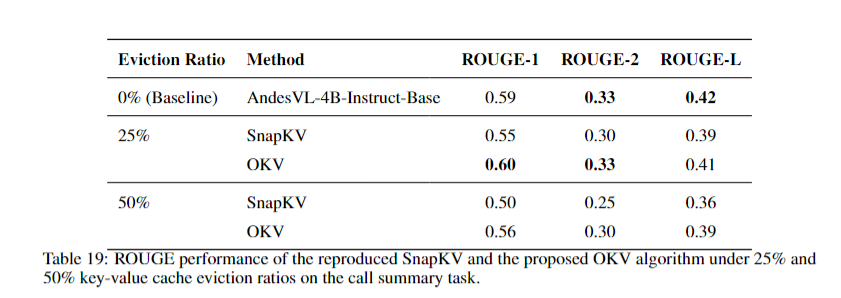 我们成功将自研的 OKV 端侧编码压缩方案应用在 OPPO 亮点功能 - 通话摘要上,可以看到在 50% 压缩率的实验条件下,相比 SnapKV 这一经典方案,模型在 rouge-1 指标上提升超过 10%。在 25% 压缩率下甚至媲美全量 KV 缓存效果。