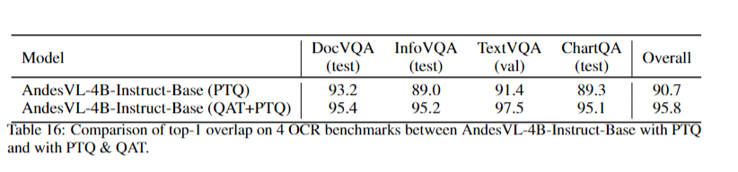 Top1-accuracy 体现了模型在量化前后解码行为的一致性。我们在端侧验证了经过量化感知训练(QAT)前后的 Ansdes-VL-4B 进行 PTQ(W4A16) 之后的精度,实验结果显示 OPPO 自研的 QAT 训练框架可以显著降低模型在端侧的量化损失。