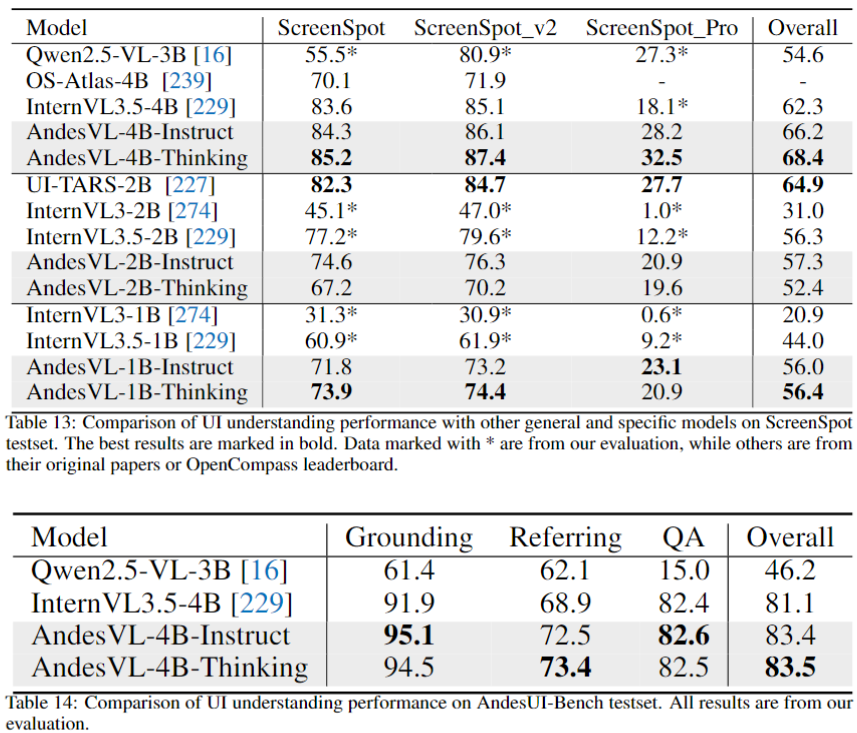 AndesVL 模型在 ScreenSpot 和我们自建的 AndesUI 评测集上均取得了领先精度。这些结果共同证明了 AndesVL 在 UI 理解和应用方面的丰富经验和独特的竞争优势。