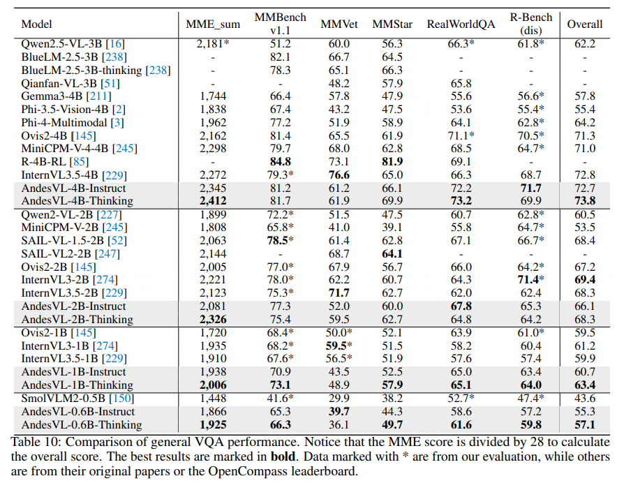 适用范围广:为满足不同资源限制和多样性应用的需求,AndesVL 提供 0.6B、1B、2B、4B 共 4 个阶梯尺寸的模型组合套装。同时,提供各尺寸模型的 Instruct 版和 Thinking 版模型,兼顾效率和效果,既适用于高效的理解生成应用需求也能应对复杂的数学推理规划应用的挑战。