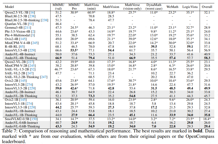 AndesVL-4B-Thinking 在各类数学与推理基准测试中以 58.3 的综合得分位居榜首,特别是在 MathVista、MathVerse 和 WeMath 基准测试中较先进模型展现出显著优势。AndesVL-2B-Thinking 模型以 45.7 的综合得分位列第二,与最高分 49.9 十分接近。此外,AndesVL 的 1B 和 0.6B 模型在各自规模组别中仅在综合得分上最高,而且在大多数单项基准测试中也是第一。