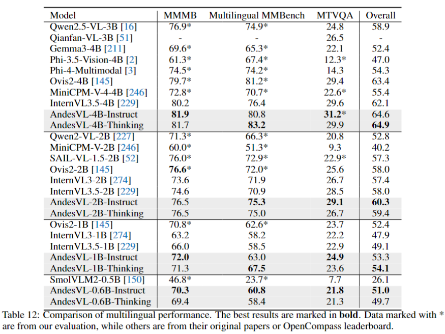AndesVL 的 Thinking 和 Instruct 模型都展现出优异的多语言能力,取得 64.9 的最高分,比之前的最佳模型 Ovis2-4B 高出 1.5 分。这种专业的多语言能力可以使模型的多模态能力能够迁移到多个语种,从而将应用扩展到更广泛、更多样化的全球受众。
