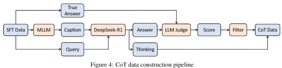 根据 DeepSeek 的实验结论,小模型可以从大模型中继承思维链的推理能力,因此 AndesVL 采用了数据蒸馏的方式,通过设计数据构造的 pipeline 来大批量获取高质量的多模态长思维链数据。
