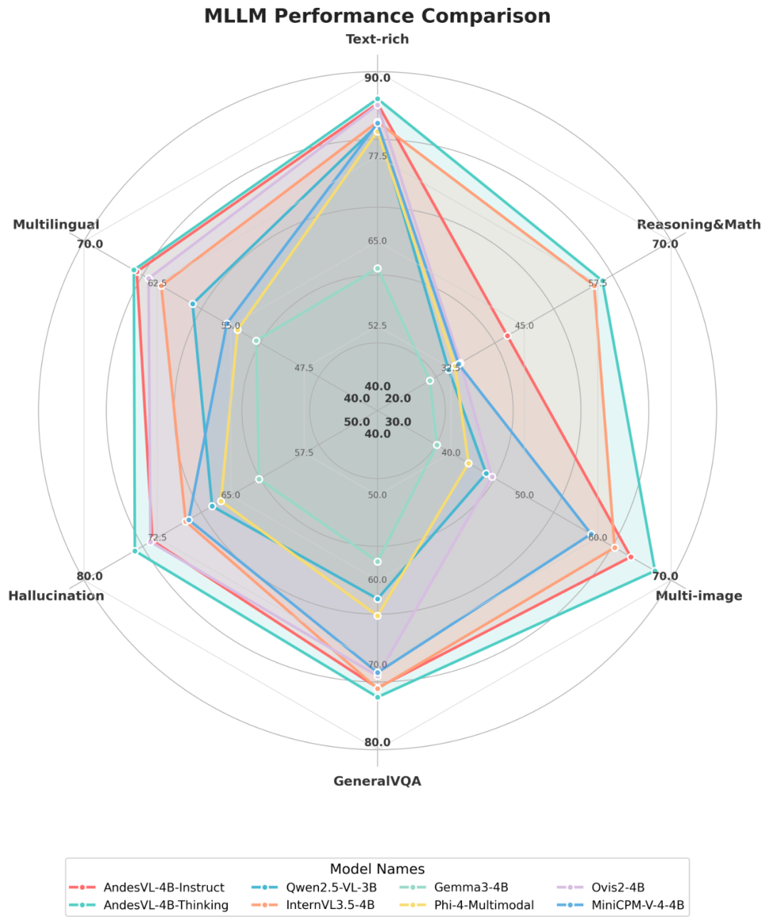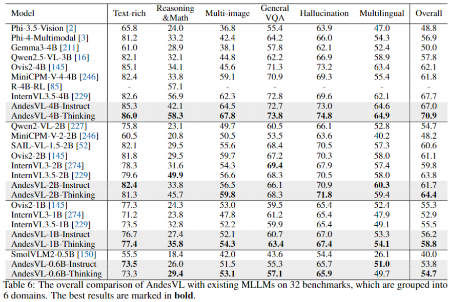 上表展示了不同多模态大模型 (MLLM) 在学术基准测试中的详细评估结果。4B-Thinking 模型 70.9 分,比第二名 InternVL3.5-4B 高出 3.2 分。在 6 大垂直领域,AndesVL-4B 均取得第一的分数,显示出其在各种多模态场景下的卓越性能。4B-instruct 在多个垂直领域同样表现出色,尤其是在多图像理解和多语言任务。AndesVL-2B-Thinking 总分 64.4,在同规模模型中排名第一,其在多图像理解和幻觉缓解方面性能突出。1B 和 0.6B 模型优势明显,thinking 和 instruct 模型分别位列同尺寸前两名。特别是 0.6B 模型,相比 InternVL3.5-1B 等各大尺寸的模型,也具有一定优势。