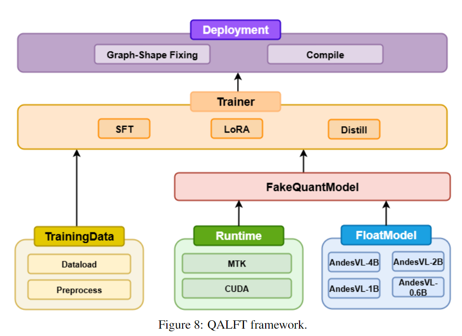 QALFT 框架的核心思想是模型、数据、训练器三方解耦,各组件可在不同训练流程中复用。同时,Runtime 库与上层设施隔离,保证训练流程可以在不同平台快速迁移。通过使用 QALFT 训练套件,我们可以快速在 MTK 硬件平台上进行模型训练和部署。