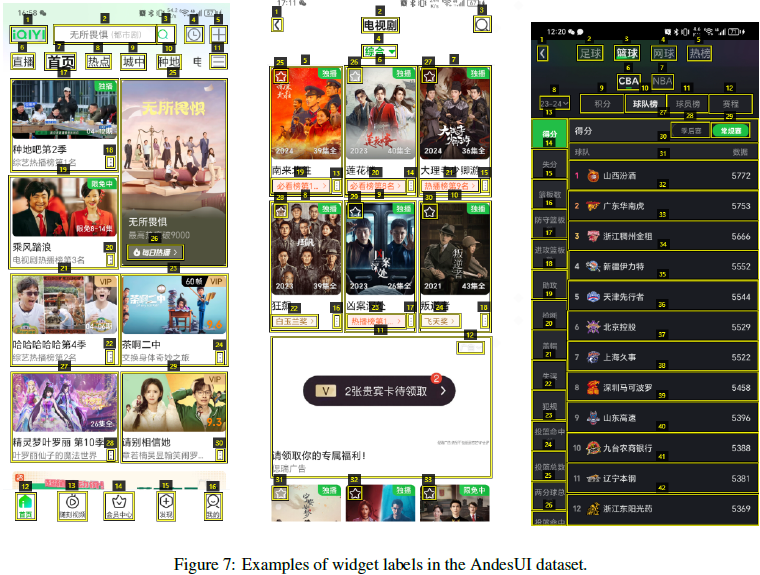 为增强 AndesVL 对智能手机 UI 的理解能力,OPPO 多模态大模型团队构建了一个专注于 UI 理解的数据集,名为 AndesUI。此数据集共收集了 90 款应用,其中包括来自 OPPO 软件商店的 65 款热门下载应用,覆盖用户高频使用的多个类别,以及 25 款 ColorOS 预装应用。标注人员被要求截取每款应用中不同且具有异构特性的页面截图,确保每张截图包含独特的布局和内容。最终共收集了来自第三方应用的 10000 张截图和来自 ColorOS 预装应用的 2500 张截图。