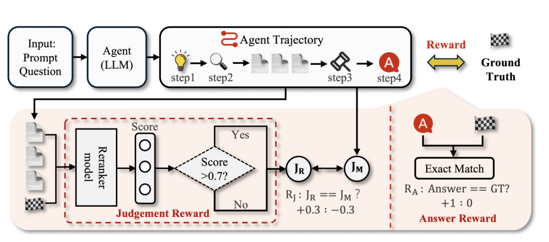 这种奖励塑造(Reward Shaping)策略为智能体提供了密集的、步进式的反馈,引导其逐步学会如何准确评估信息价值,从而使 JUDGE 动作真正有效。