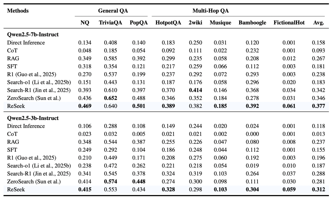 实验结果表明,ReSeek 在 3B 和 7B 参数规模上均达到了业界领先的平均性能。该模型在 HotpotQA 和 Bamboogle 等需要复杂多跳推理的基准上优势尤为突出,这证明了其自我纠错范式在处理复杂问题上的高效性。