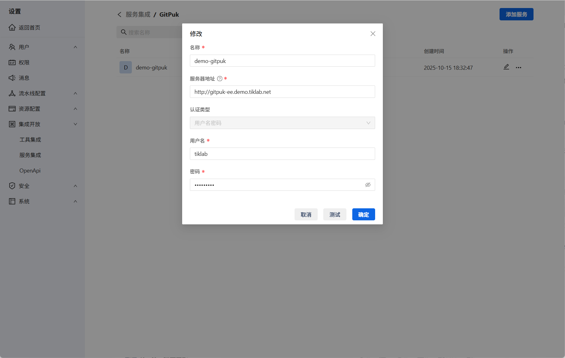 在系统设置集成开放中添加服务集成。选择GitPuk、填写名称、服务地址、认证类型(用户名密码或秘钥)、用户名、密码。