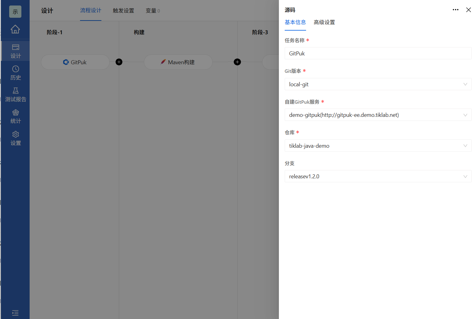 进入Arbess添加流水线,点击源码自建GitPuk选择我们需要构建的发布分支填好对应内容点击确定即可