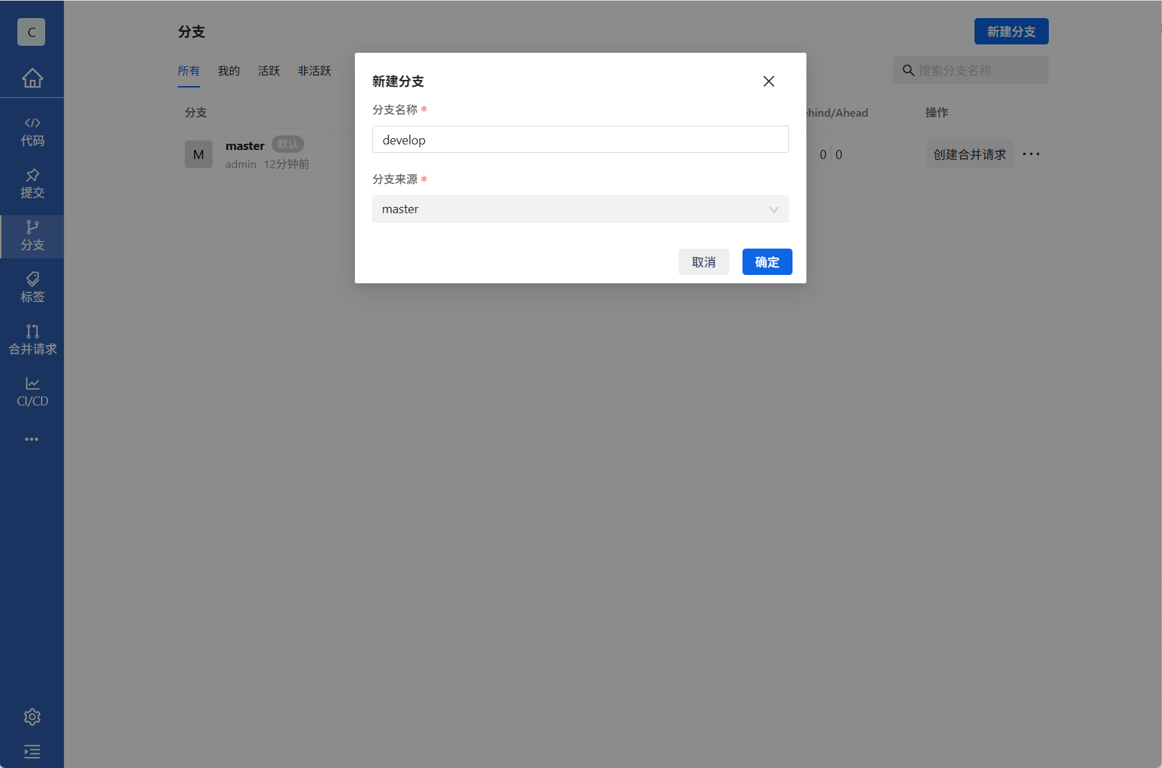 2.在分支管理中点击右上角新建分支,创建我们的开发分支输入develop点击确定即可,develop是我们的开发分支