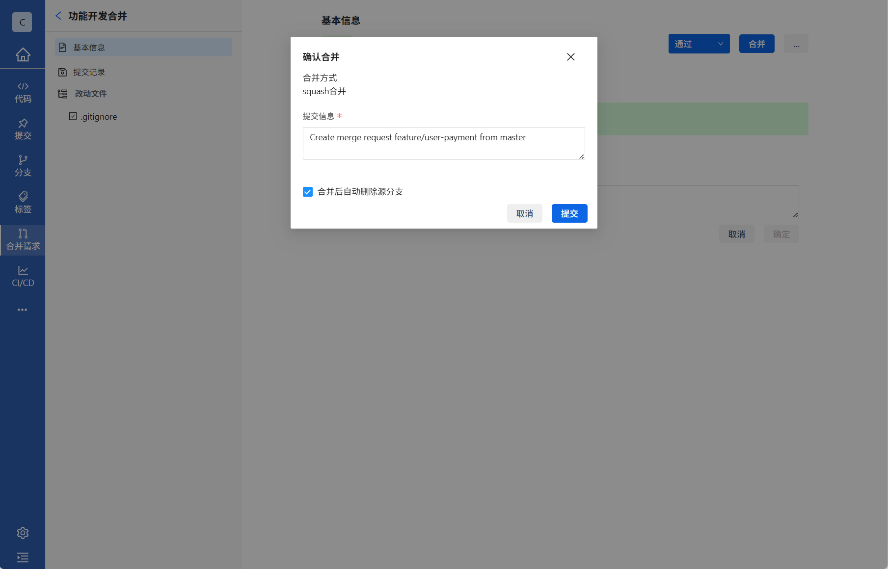 3.开发完成后,可将功能分支合并入开发分支中,合并建议选择squash合并并把合并后自动删除源分支勾选上,保持仓库整洁。