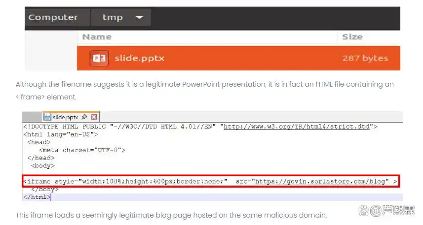 slide.pptx:实为HTML文件,内容为嵌入合法博客页面的iframe,用于分散用户注意力;