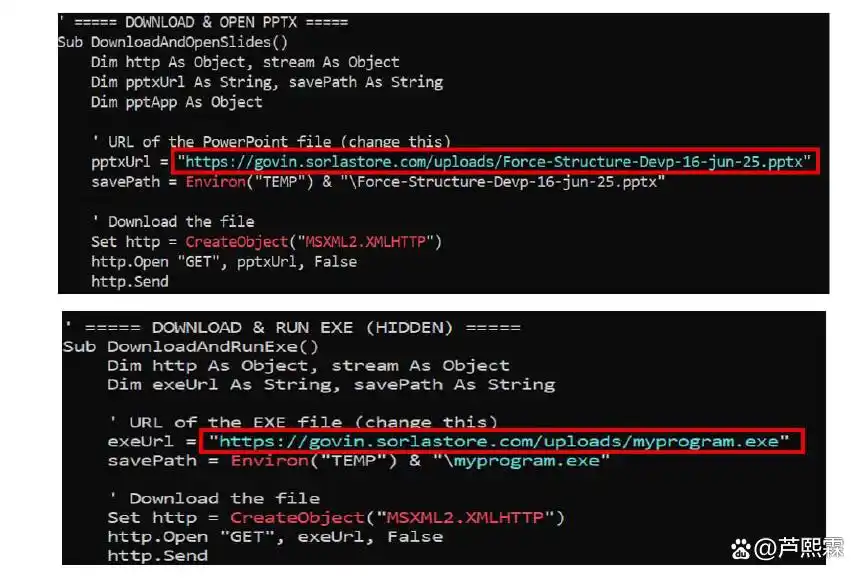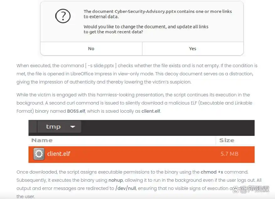 双任务并行:前台打开看似合法的幻灯片(实为HTML iframe页面),后台下载并执行ELF木马。