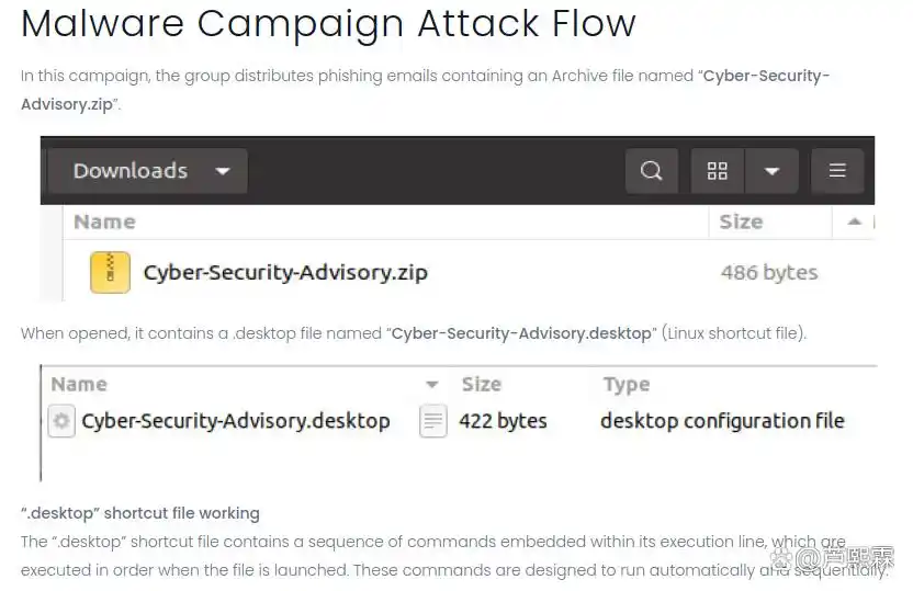根据CYFIRMA报告,本次攻击始于2025年6月7日,攻击者伪造来自“国家网络安全协调中心”的邮件,主题为“网络安全咨询通告”,附件为“Cyber-Security-Advisory.zip”。该ZIP包内含一个名为“Cyber-Security-Advisory.desktop”的Linux桌面快捷文件。值得注意的是,攻击者并未直接嵌入恶意代码,而是利用.desktop文件的Exec字段调用bash -c执行多阶段命令,体现出对Linux桌面规范的深度理解。