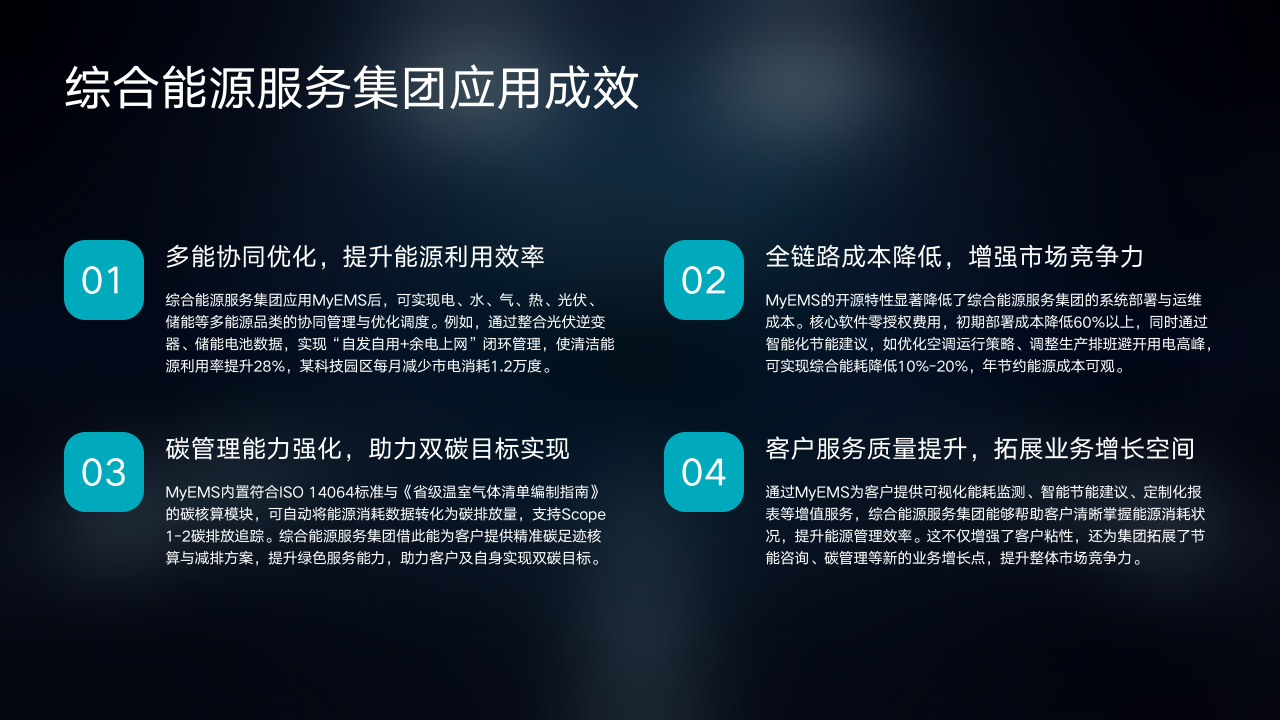 前面我们详细了解了MyEMS在热力供应、火力发电等多个领域的应用方案与技术原理。本页将聚焦典型案例与实施效果。通过实际案例,我们能更直观地看到MyEMS带来的显著成效。接下来,让我们一同看看具体案例中它是如何发挥作用的。