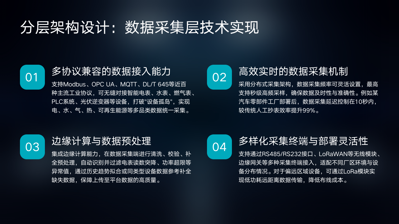 其次,该层拥有高效实时的数据采集机制。采用分布式采集架构,数据采集频率可灵活设置,最高支持秒级高频采样。这确保了数据的及时性与准确性,大大提高了数据采集的效率。就像某汽车零部件工厂部署后,数据采集延迟控制在10秒内,较传统人工抄表效率提升了99%。