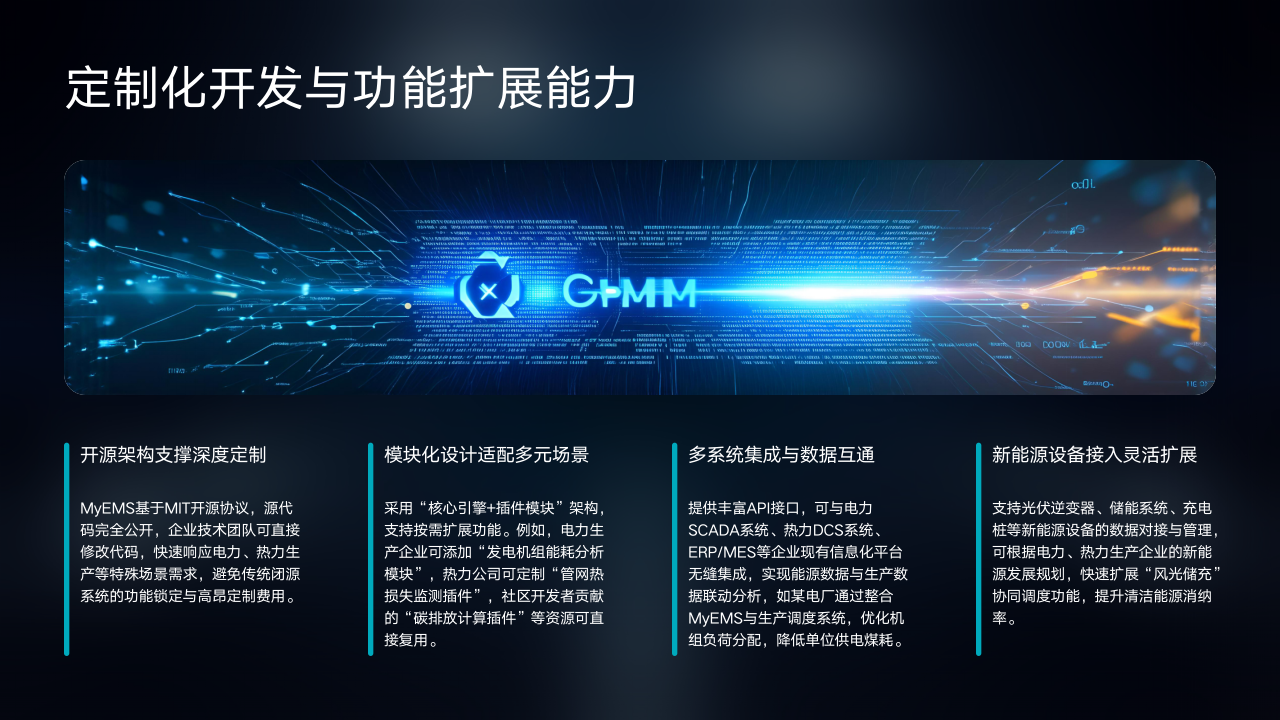 功能固化死板,难以适配个性化需求。不同行业能源消耗逻辑差异巨大,传统闭源EMS多是“标准化套餐”,功能模块固定。企业若有新增个性化需求,如“光伏并网数据对接”“车间能耗分摊”等,不仅需支付高额二次开发费用,且开发周期长达数月,无法灵活匹配企业独特场景。