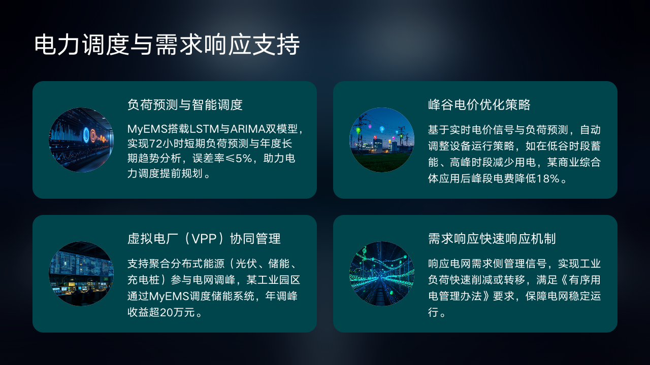 虚拟电厂(VPP)协同管理功能支持聚合分布式能源参与电网调峰。通过MyEMS调度储能系统,某工业园区年调峰收益超20万元。这不仅提高了分布式能源的利用率,还为企业带来了可观的经济效益。