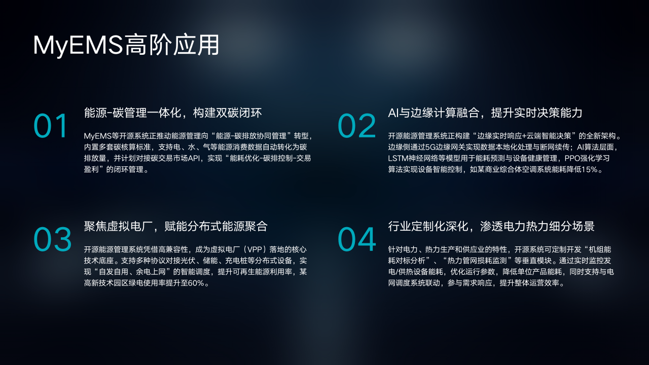 各位同仁,今天我们共同探讨了MyEMS在城市热力公司节能改造、综合能源服务集团应用等多方面的卓越表现。从智能换热站监控与优化带来的效率提升,到多能协同优化实现的能源高效利用;从显著的成本效益优势,到强大的定制化开发与功能扩展能力;从清晰的实施路径,到极具前瞻性的高阶应用展望,我们看到了MyEMS为电力、热力行业带来的巨大价值。