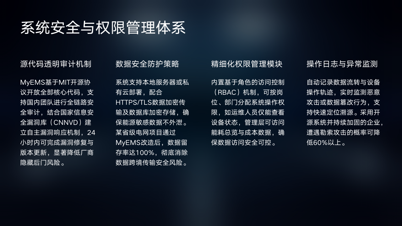 MyEMS具备完善的系统安全与权限管理体系,为能源数据安全提供全方位保障。其采用源代码透明审计机制,基于MIT开源协议开放全部核心代码,支持国内团队全链路安全审计。同时结合国家信息安全漏洞库建立自主漏洞响应机制,能在24小时内完成漏洞修复与版本更新,大幅降低厂商隐藏后门风险。