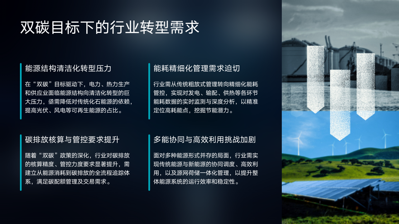 其次,能耗精细化管理需求迫切。过去行业多采用粗放式管理模式,如今需要转向精细化能耗管控。通过对发电、输配、供热等各环节能耗数据进行实时监测与深度分析,精准定位高耗能点,挖掘节能潜力,从而提高能源利用效率。