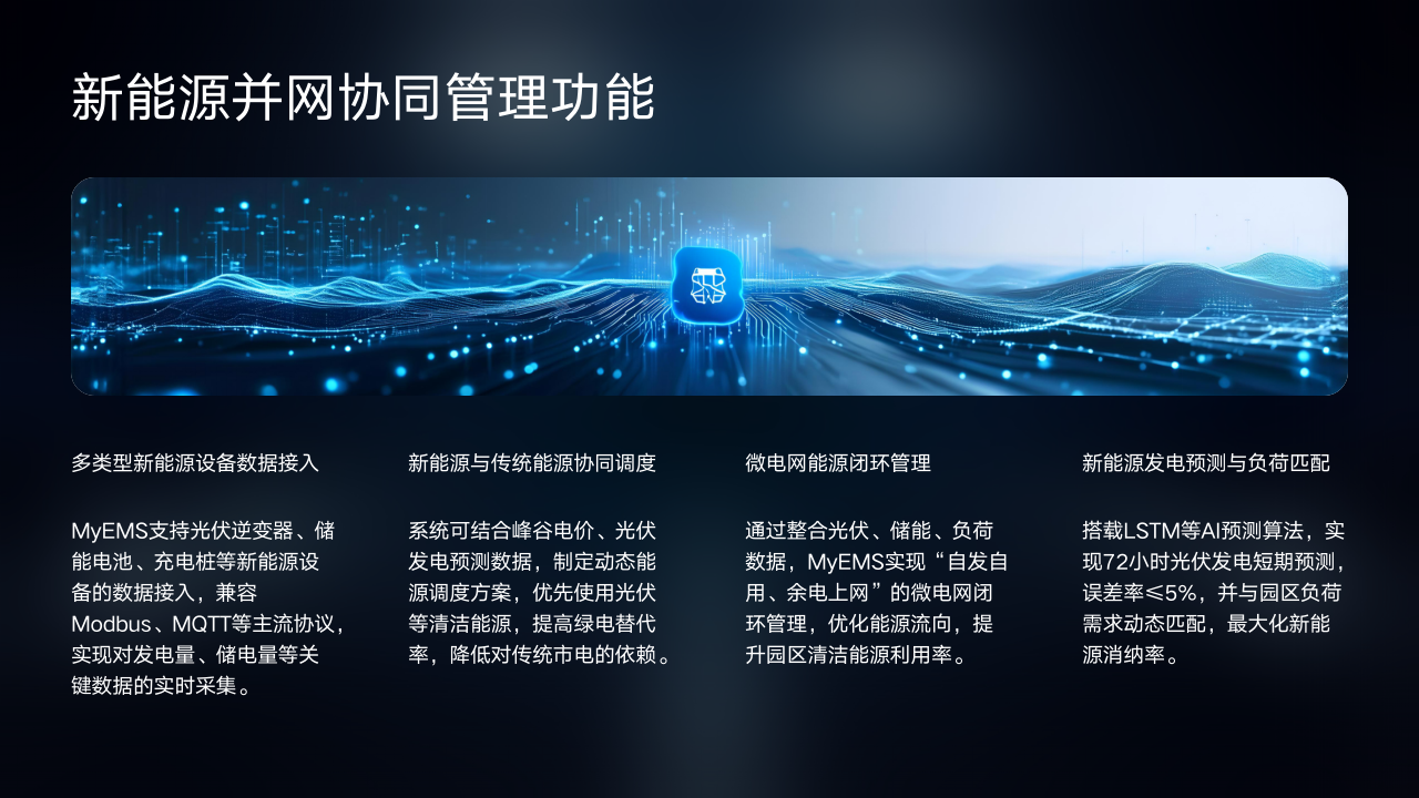 在新能源发电预测与负荷匹配上,搭载LSTM等AI预测算法,实现72小时光伏发电短期预测,误差率≤5%,并与园区负荷需求动态匹配,最大化新能源消纳率,确保新能源的高效利用。