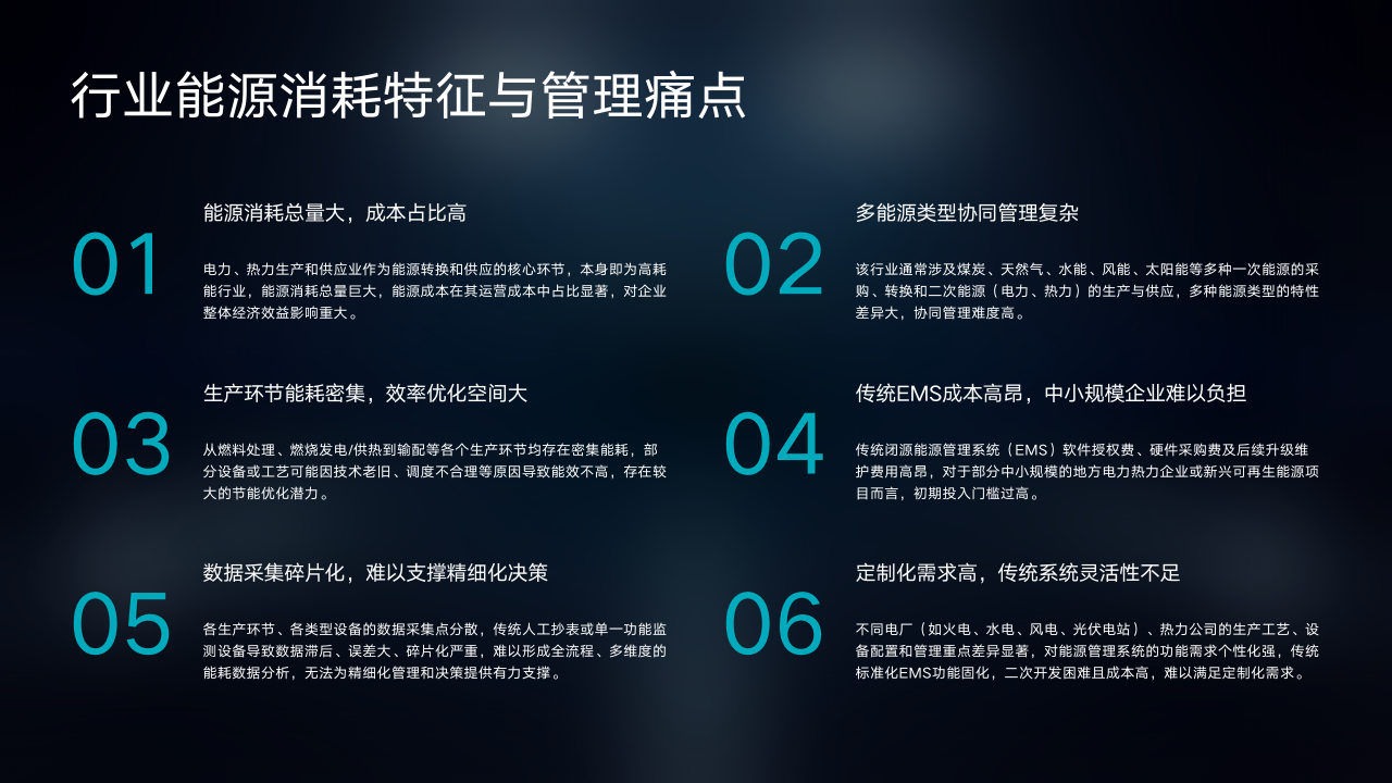 电力与热力行业能源管理存在诸多特征与痛点。其一,能源消耗总量大且成本占比高。该行业作为能源转换和供应的核心环节,本身就是高耗能行业,能源成本在运营成本中占比显著,对企业经济效益影响重大。其二,多能源类型协同管理复杂。行业涉及煤炭、天然气、水能等多种一次能源及电力、热力等二次能源,能源特性差异大,协同管理难度高。其三,生产环节能耗密集,效率优化空间大。从燃料处理到输配等各生产环节能耗密集,部分设备或工艺因技术老旧、调度不合理等导致能效不高,节能潜力大。其四,传统EMS成本高昂,中小规模企业难以负担。传统闭源能源管理系统软件授权费、硬件采购费及后续升级维护费用高昂,中小规模企业初期投入门槛过高。其五,数据采集碎片化,难以支撑精细化决策。生产环节和设备的数据采集点分散,传统方式导致数据滞后、误差大、碎片化严重,无法为决策提供有力支撑。其六,定制化需求高,传统系统灵活性不足。不同电厂和热力公司生产工艺、设备配置和管理重点差异大,传统标准化EMS功能固化,难以满足定制化需求。